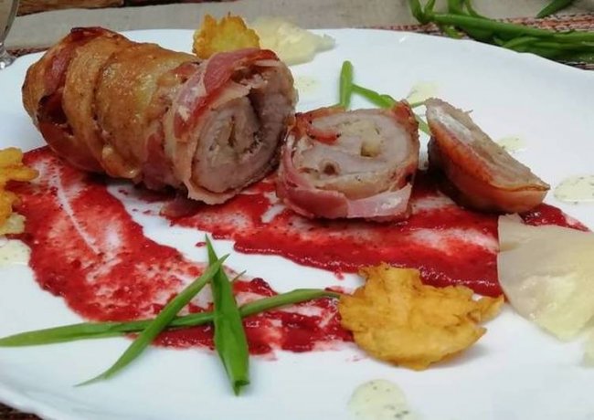 Затем аккуратно снять нитку и обернуть рулет беконом, выложить на противень с пергаментом и запечь до готовности, время от времени поливать выделившимся жиром.