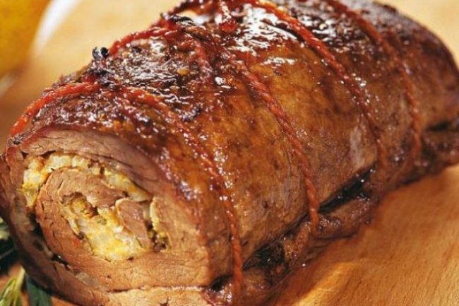 Шаг 3. Закрыть блюдо фольгой для запекания, поставить в духовку, печь в течение двух часов при температуре 180 градусов. Рулет вынуть, остудить. Снять фольгу, разрезать шпагат, нарезать мясо на кусочки по полтора-два сантиметра. Выложить банкетный рулет на тарелки, полить соусом.