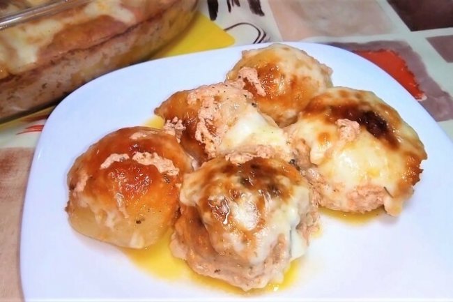 Шаг 2. В блюдо кладем очищенный картофель, в центр кладем сформированные котлеты, заливаем подливой и отправляем в разогретую духовку на 1 час. Затем посыпаем тертым сыром и отправляем в духовку на 3 минуты.