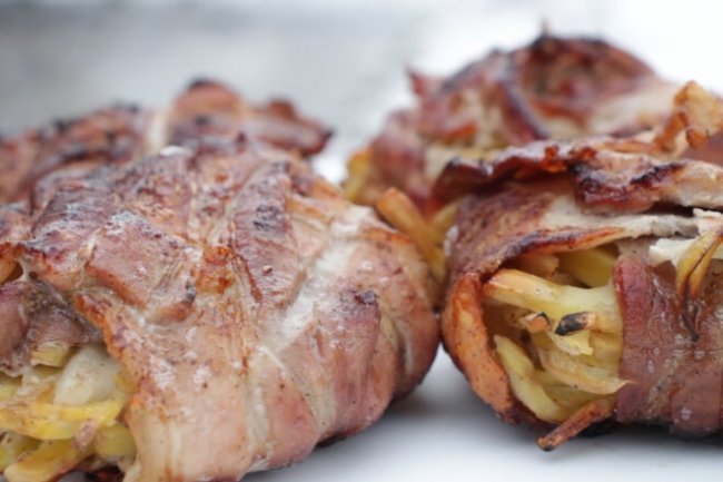 В форму выкладываем свиную грудинку, серединку наполняем картофелем с луком и накрываем всё свиной грудинкой.