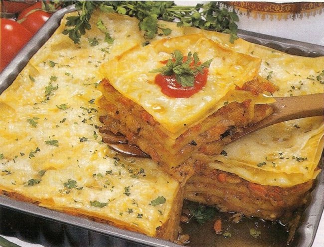 Шаг 4 В смазанную форму выложить пласты лазаньи, перекладывая их попеременно мясом и капустой.