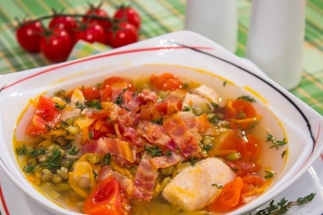 Шаг 15 Нарезать бекон и добавить в разлитый по тарелкам суп.