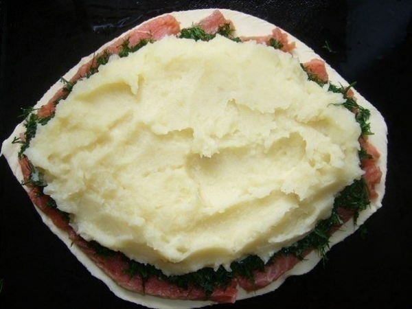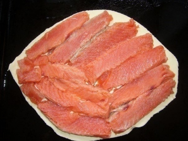 Нарезать кету ломтиками, выложить на тесто, посолить.