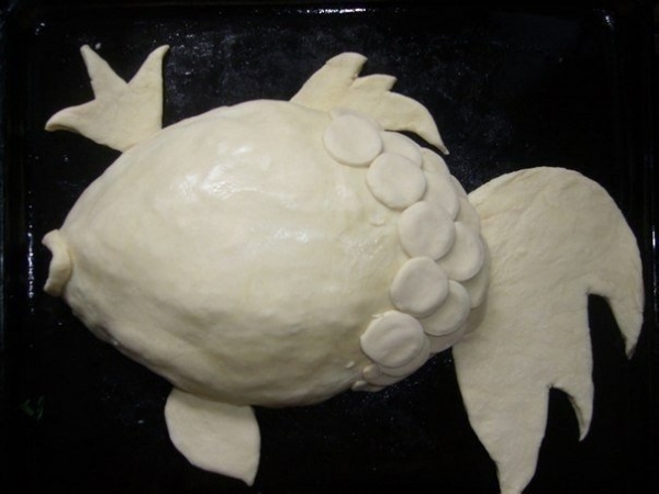 Яйцо разделить на белок и желток. Вырезанные кружки выложить в виде чешуек, начина с хвостовой части, тесто перед этим смазав белком (он послужит клеем).