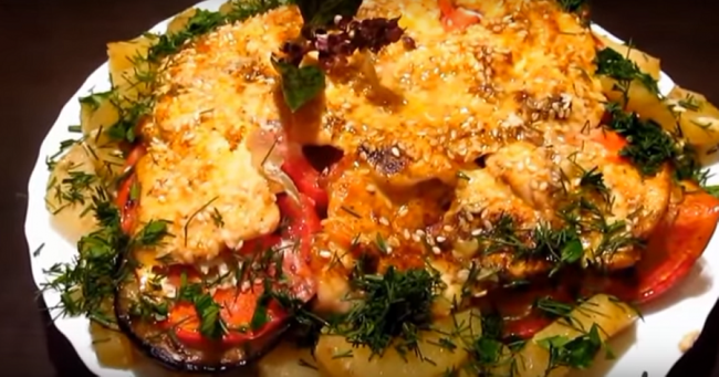 Разогреваем духовку до 200 градусов и выпекаем блюдо 40 минут. Слоеная курочка готова, можно подавать к столу.