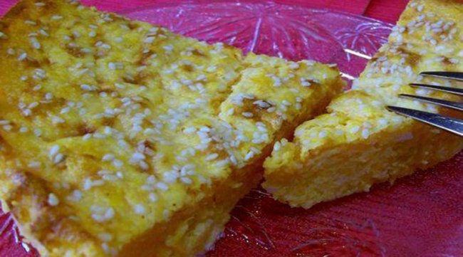 Форму для выпекания смажьте маслом и выложите в нее запеканку. Посыпьте сверху кунжутным семенем.