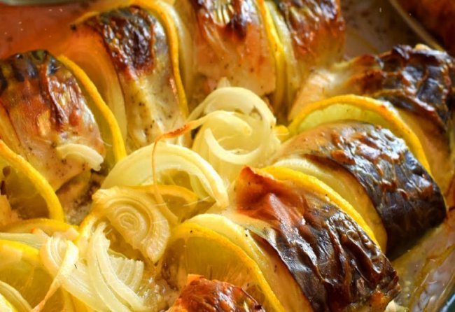 Обмазанные кусочки скумбрии кладем в форму для запекания, чередуя ломтиками лука и лимона.