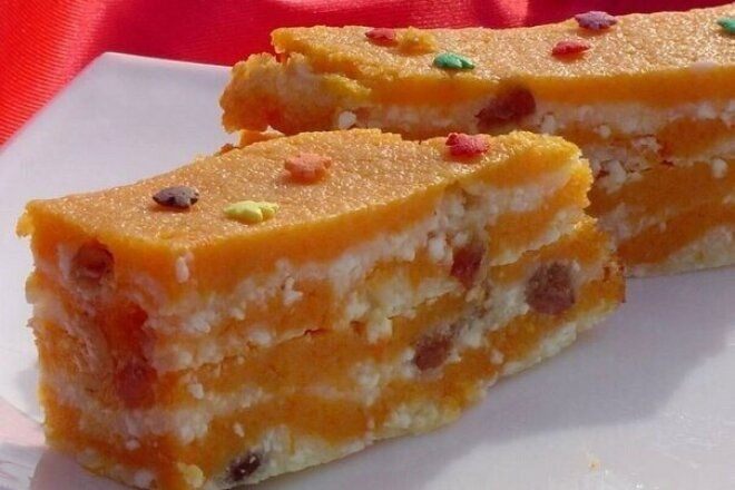Можно сделать «слоеную» запеканку, для этого тыкву натереть и выкладывать в форму слоями, перемежая творожной массой. Готовое блюдо украсить цветной кулинарной посыпкой, мармеладом, сахарной пудрой.