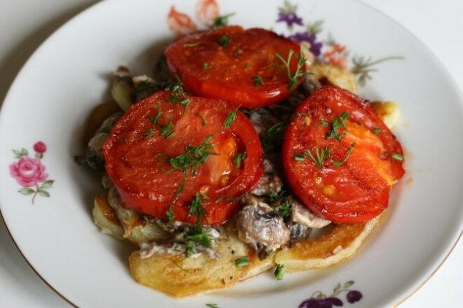 На общее блюдо выложить грибы, затем кабачки и помидоры.
