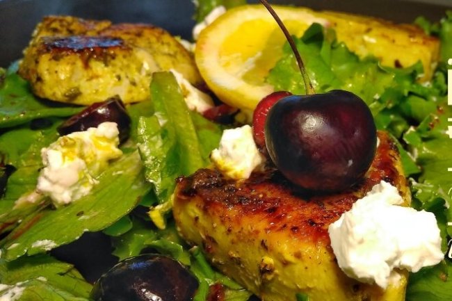 Листья салата нарвать, добавить черешню без косточек, брынзу, индейку и лимонные дольки. Заправить оливковым маслом.