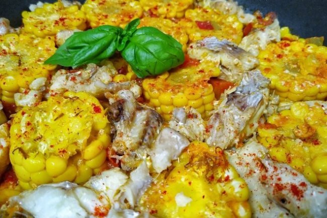 Морской окунь в вине и томатах со свежей кукурузой - «Второе блюдо»