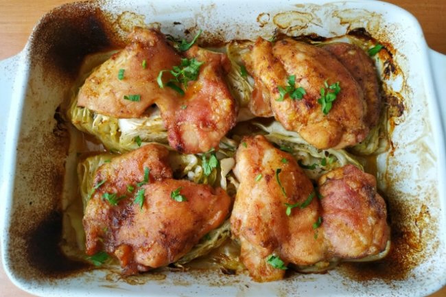 Куриные бедра на подушке из капусты запеченные в духовке - «Второе блюдо»