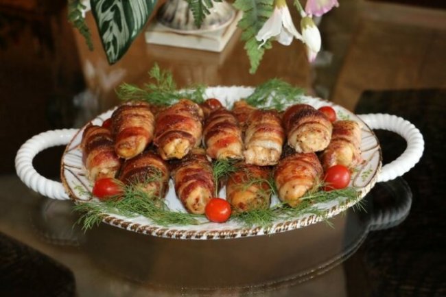 Заготовки скрутить в рулеты, обмотать полосками бекона.