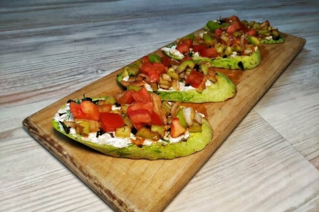 На дольку обжаренного кабачка намазать сыр фета, посыпать укропом и базиликом, сверху выложить овощную начинку.