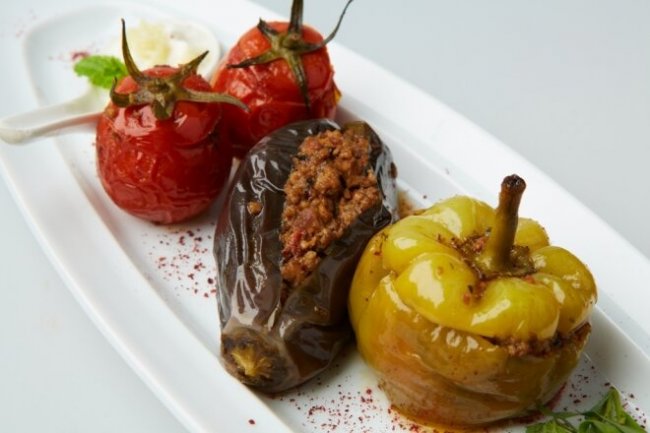 Заполнить долму из помидоров, баклажанов и перцев фаршем.