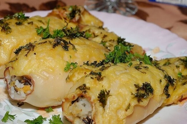 Все ингредиенты смешать, заправить майонезом. Нафаршировать кальмары. Форму или противень смазать растительным маслом, промазать фаршированные тушки майонезом, поставить в духовку на полчаса, температура – 220 градусов. При подаче кальмары «Белоснежка» посыпать рубленой зеленью петрушки.