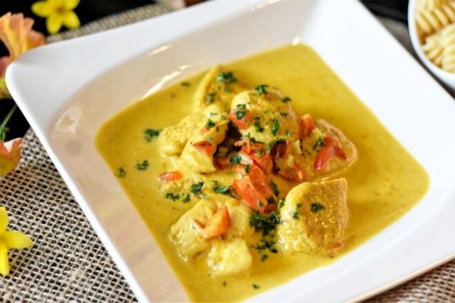 В пиале перемешайте сметану, приправу карри, молотые перцы черный и чили до однородности. Добавьте получившийся соус к курице, перемешайте.