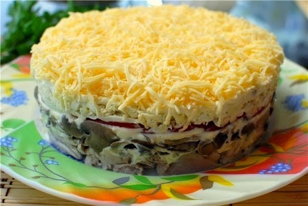 Мелко покрошить лук, шампиньоны и обжарить на оливковом масле. Курицу порезать на небольшие кусочки. Помидоры порезать на тонкие кольца. Укладываем ингредиенты на блюдо слоями: курица - майонез, грибы с луком - майонез, помидоры - майонез, и обильно посыпать сыром. Дать настояться салату в холодильнике два часа.