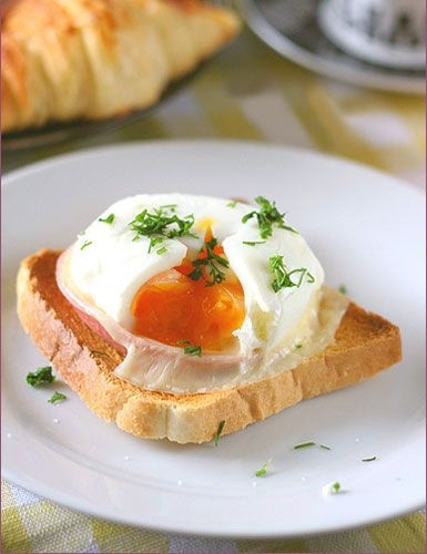 Сварить яйца «в мешочек». Для этого яйца в скорлупе положить в кипящую воду и варить 5 минут, затем яйца вынуть и сразу же поместить в холодную воду. Сделать тосты. Если у вас нет тостера, можно использовать гриль в духовке, а можно и поджарить на сухой сковороде. Выложить поджаренный тост на тарелку, сверху положить кусочек ветчины, сыр – отправить все это в микроволновку, буквально на 1-2 минуты, чтобы сыр немного расплавился. Сверху выложить яйцо и надрезать его с одного бока. Посолить, посыпать немного зеленью.