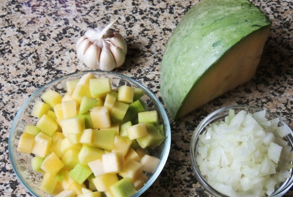 Тыкву очисти от кожуры, семена удали, нарежь кубиками. Лук измельчи.