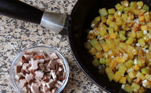 Обжарь лук, добавь к нему тыкву, посоли и приправь тимьяном, туши под крышкой 10 минут. Добавь к овощам нарезанную буженину и измельченный чеснок.