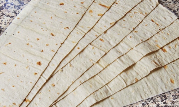 Лаваш нарежь на полосы размером примерно 35 х 10 сантиметров.