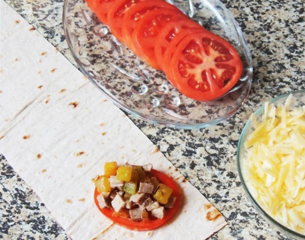 Каждую полоску смажь сметаной. На край выложи кружок помидора, 1 ст. л. подготовленной тыквенной начинки и горсть тертого сыра. Угол загни и продолжай сворачивать, меняя сторону сгиба.