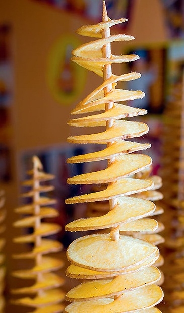 Картошку хорошенько вымыть, почистить и нарезать очень тонко кружочками. Кусочки нанизать на деревянные палочки. Нагреть растительное масло в большой и глубокой сковороде или другой емкости. Опустить шампур с картошкой в раскаленное масло.
