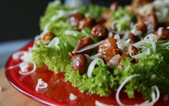 Листья салата заправить. Выложить на нарезанный салат лисички, сверху посыпать тертым сыром. Подавать теплым.