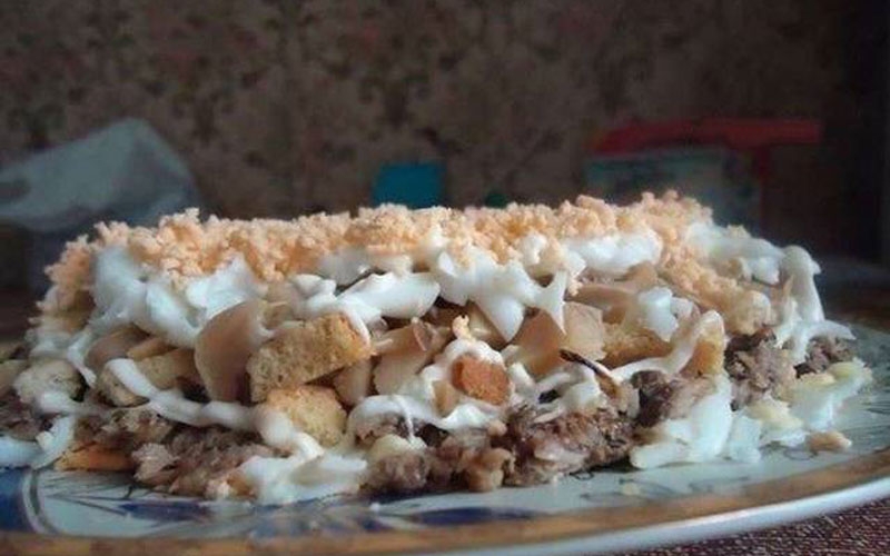В салатнике продукты укладываются слоями: два яйца (тертые), рыбная масса, лук, небольшое количество майонеза, все сухари, снова майонез, нарезанные грибы, белки, желтки будут идти сверху.