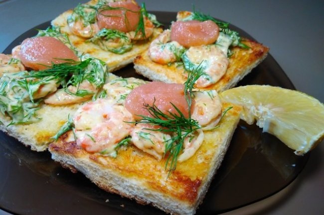 Шаг 4. Выложить на тосты начинку из креветок, а сверху выложить по чайной ложке икры минтая.