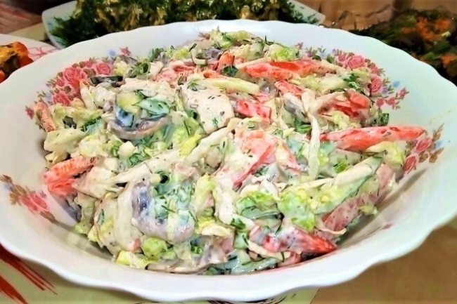 Шаг 4. Нарезаю зеленый лук, петрушку, все ингредиенты смешиваю с тонко нарезанной пекинской капустой, добавляю черный молотый перец, солю по вкусу и добавляю майонез, перемешиваю и сразу подаю к столу.