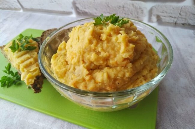 Шаг 4. Добавляем к отваренной фасоли обжаренные овощи, все специи (при желании вы можете добавить специи, которые нравятся вам), и измельчаем все блендером. Доводим до нужной консистенции с помощью отвара от фасоли.