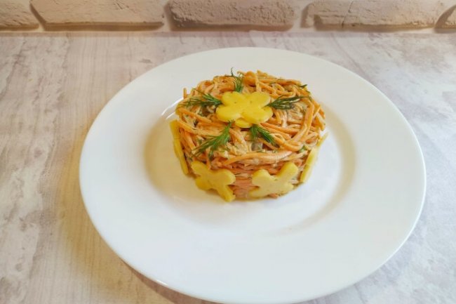 Салат Торнадо с корейской морковью, печенью и сыром - «Закуски»
