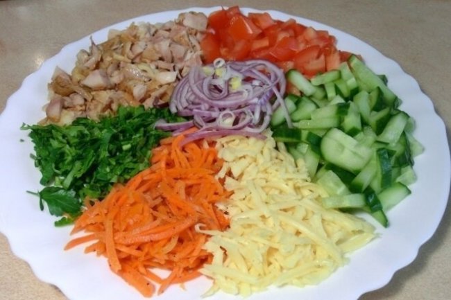 В салат можно добавить маринованные грибы, тертый сыр.