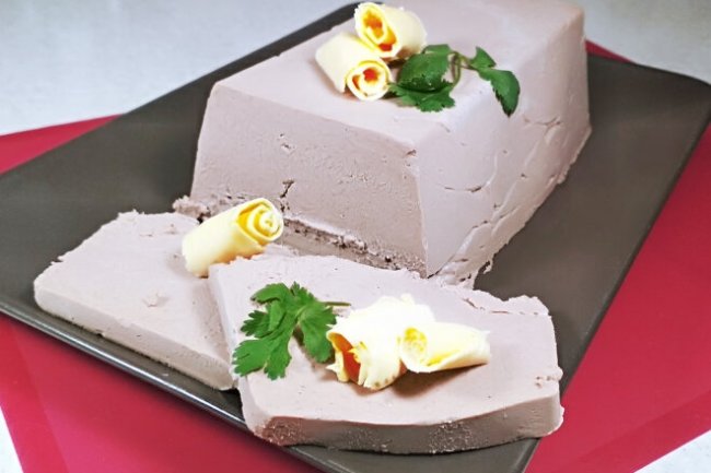 Получившийся паштет выложить в прямоугольную форму (в рецепте силиконовая 10х20х6 см), разровнять поверхность, потрясти форму, чтобы убрать пустоты и поставить для застывания в морозильник на 3 часа или в холодильник на ночь