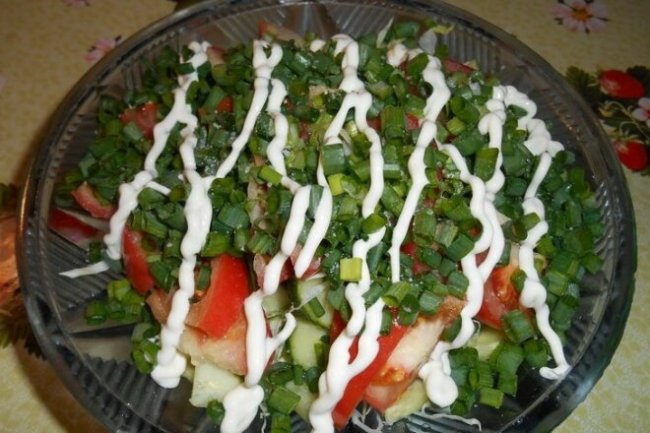 Овощи насыпать поверх салата вместе с зеленым луком и петрушкой.