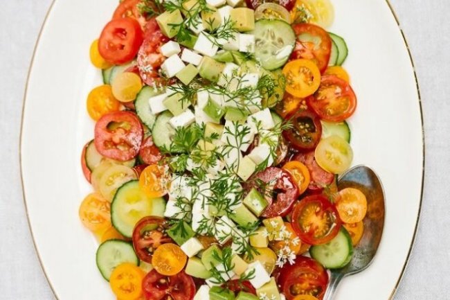 Часть огурцов перемешать с помидорами черри, нарезанным кубиками авокадо, сыром «Моцарелла».
