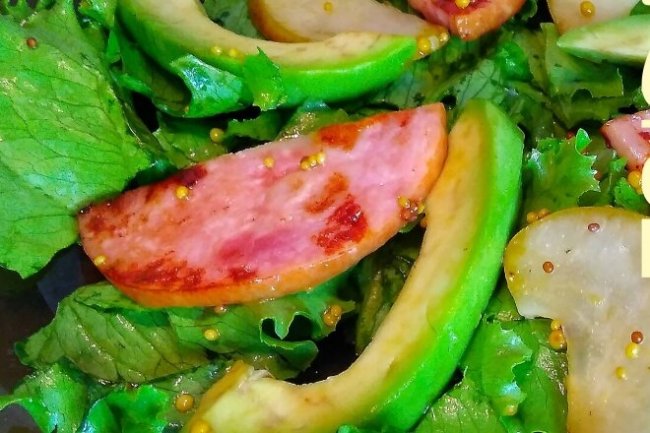 Листья салата нарвать, добавить ветчину, авокадо, груши и полить оливковым маслом.