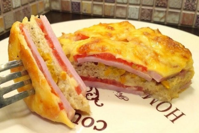 Помидоры и ветчину нарезать кружочками, уложить их между кусочками батона.
