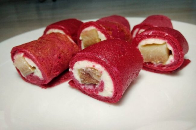 Свекольные блины на молоке и ряженке с сыром и сельдью - «Закуски»