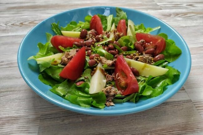 Кусочки консервированного тунца размять вилкой, отправить в тарелку с салатом, посыпать консервированной фасолью.