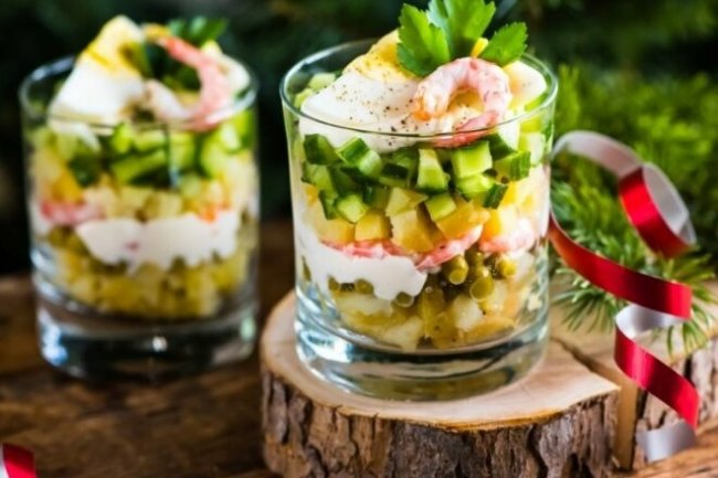 В прозрачные широкие стаканы выложить слоями отваренный и нарезанный картофель, свежие и соленые огурцы, яйца, горошек, ветчинную колбасу, креветки, горошек.