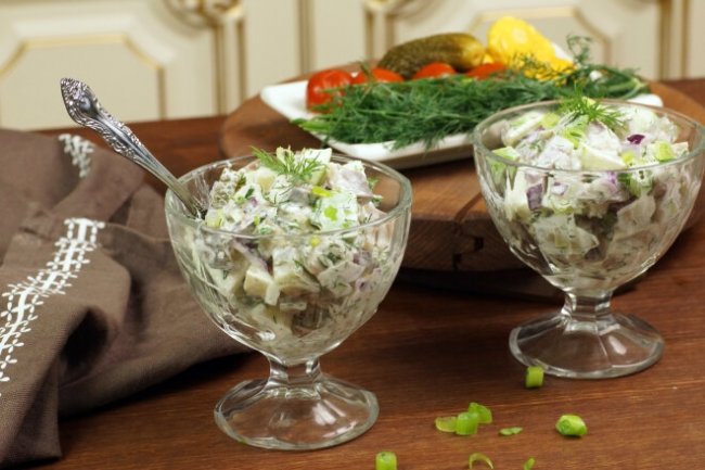 Для заправки салата будем использовать сметану. Хорошо перемешиваем немецкий салат. Наша селедка по-баварски готова. Приятного аппетита!