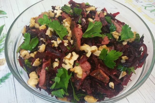 В глубокой миске смешать натертую свеклу, печень, измельченную зелень петрушки или кинзы, чеснок (тоже предварительно измельчить), соль. Заправить растительным маслом.