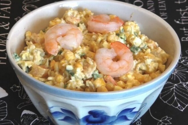 Затем - 3-4 ст. л. майонеза и 140 гр. консервированной кукурузы. Смешать.