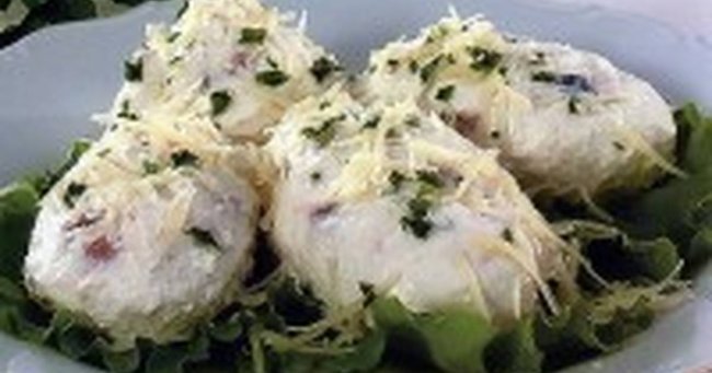 Шаг 2 Из приготовленной смеси сформовать «яйца», уложить их на салатные листья, полить майонезом и посыпать оставшимся сыром.