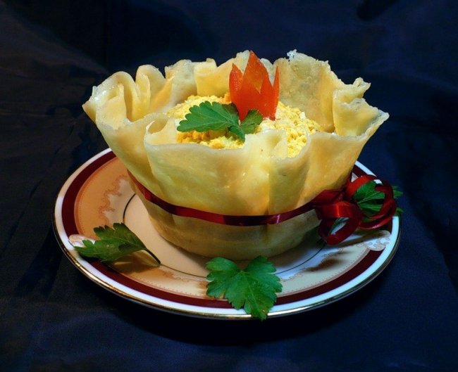 Шаг 7 Сырная корзинка - натереть сыр на крупной терке и выложить на раскаленную сковороду тонким слоем, сыр расплавится аккуратно снять и опрокинуть на перевернутую банку, поставить на 10 минут в холодильник.