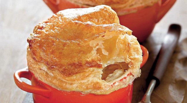 Тесто раскатайте в пласт толщиной 1 см. Вырежьте из него кружки диаметром чуть больше диаметра кокотниц. Смажьте края кружков взболтанным яйцом, накройте кокотницы и прижмите края теста к краям посуды.