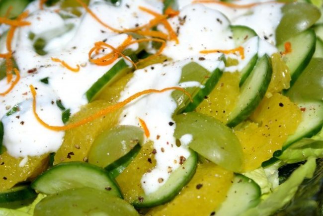 Шаг 1 Листья салата порвать вручную. Огурцы порезать так, как вам больше по душе. Виноград полностью очищается от косточек, после чего каждая отдельная ягода разрезается на две равные части. Апельсин почистить и нарезать дольками.